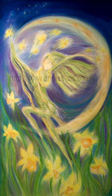 The spring goddess leaps through the daffodils within a new moon on Imbolc a celebration of the lifeforce as mother earth awakens, a pastel drawing in blues greens yellows and purples.