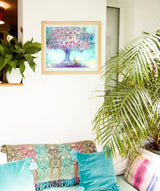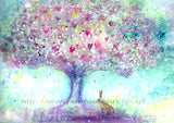 A brown hare sits under a magical tree full of blossoms full of hearts and butterflies. Watercolour style painting in gentle pinks, purples and turquoise. Hare art.
