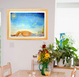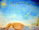 A shamanic figure sleeps under a a starry sky and full moon, her head leaning on a sleeping bear. The symbol of the labyrinth is on his the bear's back. A labyrinth, unlike a maze, has only one path, leading from the entrance to the centre and out again in one direction. Often carved on Stone Age monuments such as Stone henge, the labyrinth symbol represents the soul's journey into the centre of the uterine underworld and its return toward rebirth.