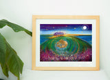 A top quality print of the the painting of the magical trees you can see on the road home to Cornwall . Hare sleeps deep within the hill of flowers under a new moon and starry sky.